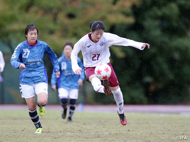 全日本大学女子サッカー選手権大会を2連覇中の早稲田大学(関東/東京)は愛媛FCレディース(なでしこ2部/愛媛)との一戦に臨みました。前半は互いにシュート1本と膠着したゲーム展開が続きましたが、66分に村上真帆選手のゴールで先制した早稲田大が勝利を収め、2大会ぶりの2回戦突破を果たしました。