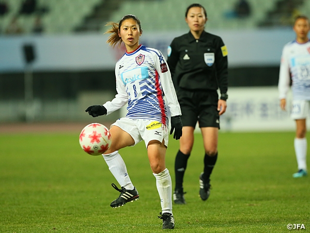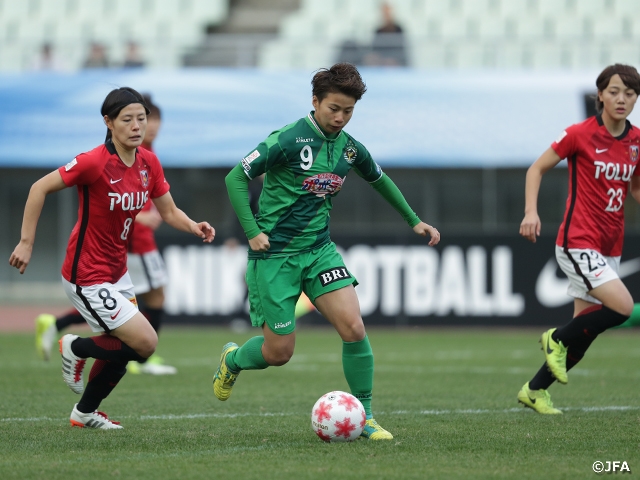 幸先良く先制したのは、先のEAFF E-1 サッカー選手権2017決勝大会に出場したなでしこジャパンの選手を多く擁するベレーザでした。18分、長谷川唯選手のクロスに田中美南選手が頭で合わせて今大会5得点目。「唯がドリブルで抜けてくるのは分かっていたので、自分も(ゴール前に)入っていった。今季やってきたことが出たゴール」と、田中選手が満足そうに話した先制弾でした。