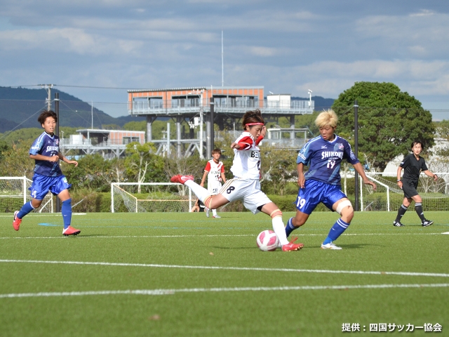 四国4県から2チームずつ、計8チームによるトーナメント戦を行い、優勝したFC今治レディースが皇后杯出場権を手にしました。1回戦はF.C.CORMOLADIES AZALEAに9-0と大勝し、準決勝は鳴門渦潮高校に3-0で勝利。決勝は四国学院大学香川西高校、愛媛FCレディースMIKANを下して勝ち上がってきた四国大学イーグレッツと対戦しました。開始6分に先制を許す苦しい展開を強いられましたが、51分に竹田果矢選手のゴールで同点に追いつくと、74分に渡邊玲奈選手がPKを決めて勝ち越しに成功。そのまま逃げ切って2年連続2回目の皇后杯出場となりました。