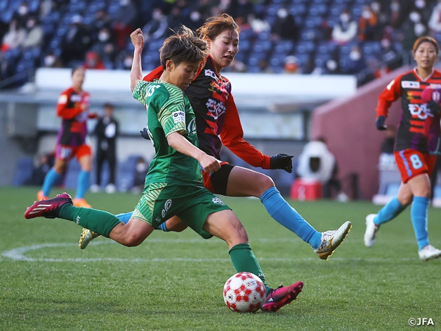 会場のヨドコウ桜スタジアムは一時雪が降りましたが、キックオフ前に止んで日本一のチームを決するに相応しい舞台が整いました。WEリーグで4位の日テレ・東京ヴェルディベレーザ(WE/東京)とWEリーグで首位を走るINAC神戸レオネッサ(WE/兵庫)の、なでしこジャパン(日本女子代表)選手を擁するチーム同士の一戦は、山下良美主審のホイッスルで開始しました。