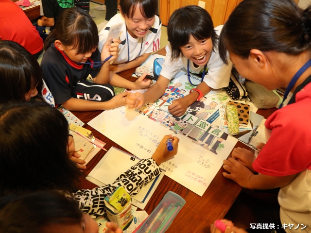 昼休みには、ナショナルトレセンコーチが、少女期におけるけが予防のための「体幹トレ-ニング」も紹介。夕食後は宿泊ホテルにおいて、メインスポンサー「キヤノン」とサッカーの関わりを紹介し、当日撮影した選手のプレー写真がスクリーンに投影されました。さらに協賛の大塚製薬によるベストコンディションのための水分補給セミナー、ナショナルトレセンコーチによるリスペクトワークショップを行い、選手たちが「大切に思うこと」や「支えてくる人たちへの感謝の気持ち」を新たにしました。