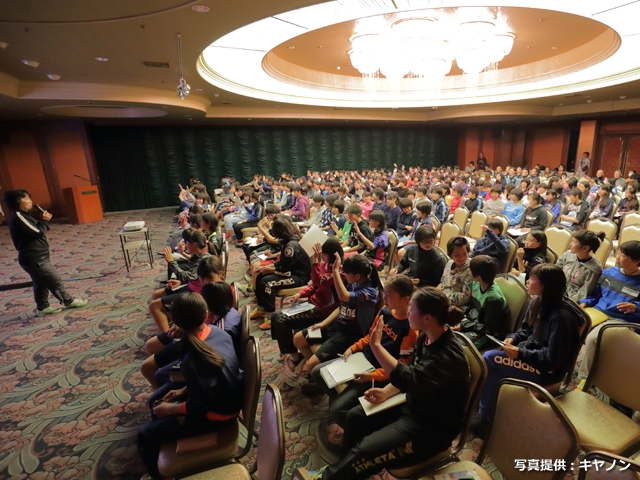 3月4日(土)、静岡県磐田市の磐田スポーツ交流の里ゆめりあ競技場で、キヤノン ガールズ・エイト東海大会が開幕しました。出場チームは静岡県4、愛知県4、三重県1、岐阜県2の全11チーム。大会1日目は5チーム、6チームのブロックによる予選リーグを行いました。試合終了後は宿泊先の浜松グランドホテルにおいて、選手を対象にキヤノンによる大会映像セレモニーおよび大塚製薬の水分補給セミナーが行われたほか、JFAナショナルトレセンコーチの山口小百合によるリスペクトプログラムが行われました。
