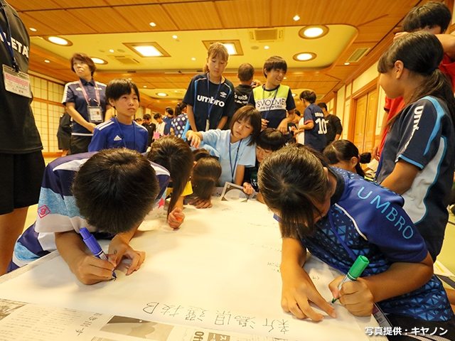 大会1日目の試合終了後には、選手と指導者を対象に、特別協賛社のキヤノン株式会社による映像上映、協賛社のホクト株式会社による食育セミナー、JFAナショナルトレセンコーチによるリスペクトワークショップが実施され、自分たちのプレー映像を見ることや、普段の食事の内容の見直しについて考えること、サッカーができる環境に対する様々な方々へのリスペクトについて話し合うことなど、選手間の良い交流の機会となりました。