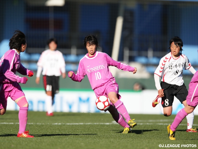 準決勝第1試合では日ノ本学園と神村学園が対戦。序盤のピンチをしのいだ日ノ本学園は13分に入江未希選手のゴールで先制すると、2分後にも入江選手が加点し、リードを広げます。後半も1点を追加した日ノ本学園は、終盤の神村学園の反撃を無失点に抑え、決勝へと勝ち上がりました。