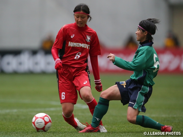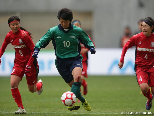 無得点で迎えた後半、攻撃と守備が激しく入れ替わります。65分、日ノ本学園の渡部選手が右サイドから放ったシュートはゴール左へ。常盤木学園も74分、小林里歌子選手との連係から三橋明香選手がシュートを放ちますがGK木付選手が阻止。81分、日ノ本学園は平塚万貴選手がゴール前でシュートも枠をとらえられません。常盤木学園も90分、絶好の機会を得ます。小林選手がDFラインを突破して前を向くとゴール前へパス、そこに走り込んでいた杉原選手のシュートは惜しくも右ポストをたたきます。試合は0-0のまま延長戦へ入りますが両者一歩も譲らず、勝負はPK方式へ。1人目、4人目と外した常盤木学園対し、4人目まで全員が成功した日ノ本学園が2連覇を飾り、夏のインターハイとの2冠を2年連続で成し遂げる史上初の快挙も達成しました。