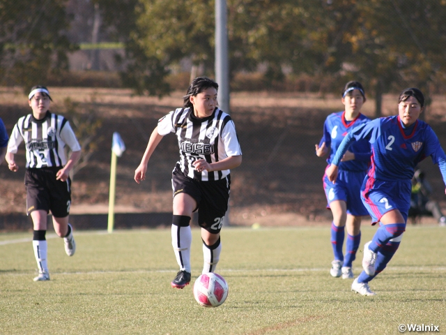 みきぼうパークひょうご第2球技場での第2試合では、開志学園JSC高等部(北信越2/新潟)と北海道文教大学明清高校(北海道1)が、互いに初となる8強進出を争いました。試合は早々に動きました。開始8分、左サイドからのボールを受けた開志学園FW山本葉桜選手が中央へと流れながらペナルティアーク手前でシュート。このミドル弾がゴール左に突き刺さり、先制点となります。21分には稲村雪乃選手が蹴った右コーナーキックが直接ゴールに入り、点差が広がります。稲村選手は4分後にもショートコーナーキックを受けると狙いすましてゴール右隅を射抜き、3-0。38分には北沢明未選手が中央突破からループシュートでGKの頭上を抜き、開志学園が4点リードで前半を終えました。