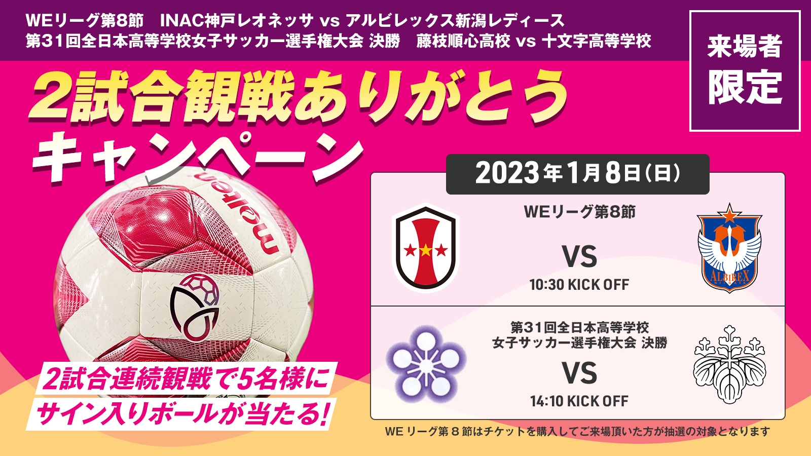 2試合をご観戦頂いた皆さまの中から抽選で5名様に、全日本高等学校女子サッカー選手権に出場経験のあるINAC神戸レオネッサとアルビレックス新潟レディースの選手のサインボールをプレゼントするキャンペーンも実施しています。ぜひ多くの皆さまのご来場をお待ちしています。