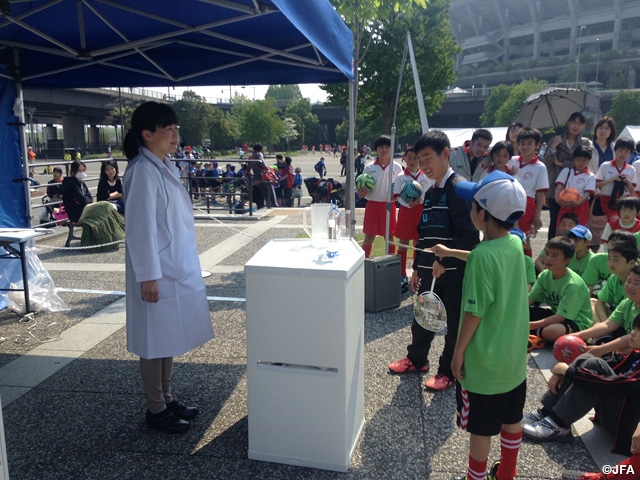 汗の役割や水分補給の仕組み、熱中症にならないための注意点、スポーツドリンク「アクエリアス」が運動する時の水分補給に適している点とその効果的な利用法について、簡単な実験やパネルを使って、子供から大人まで楽しくわかりやすく学べる「アクエリアス U-12フットボール ラボ」。