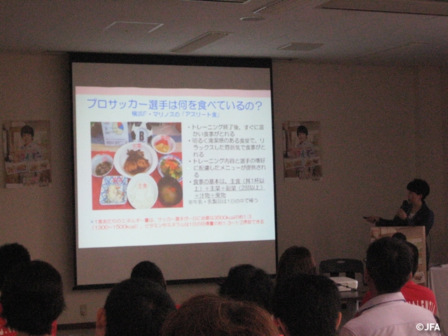 セミナーでは食育のプロ、株式会社フードコネクションの橋本玲子さんによる講義が行われました。スポーツをする子供が強い体をと心をつくるための7つのルール、トッププロ選手の食事メニュー作り、トップアスリートの食の共通点などが紹介され、参加された方からはトップ選手を目指すお子さんのために、細かな質問も飛び交います。「疲れをとるためには?集中力を保つためにはどのような食事がよいでしょうか?」、「暑い中での練習で、帰宅後、ごはんがのどを通りにくい悩みがあるが、冷やし中華のような食事でもよいのでしょうか?」、「練習から夜遅く帰ってきて、夜寝る前にたくさん食べることは問題はないのでしょうか?」など、パパ・ママの食育についての悩みが投げかけられました。