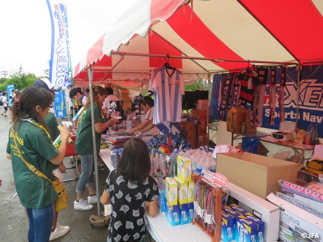 ゼビオブースでは、選手や応援する方にスポーツーグッズを販売し、連日多くの子どもたちが集まっています。グッズ購入者には大会特別シールをプレゼント。さっそく応援メガホンにシールを貼っていました。準決勝・決勝の愛鷹競技場にも出店を予定しています。