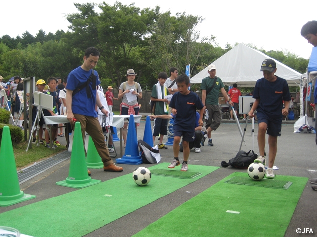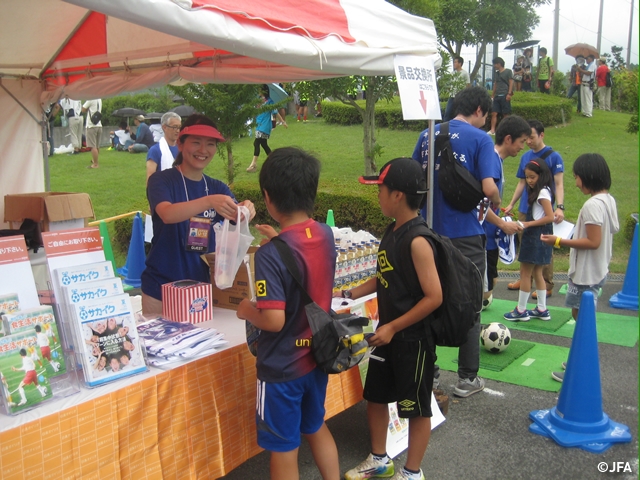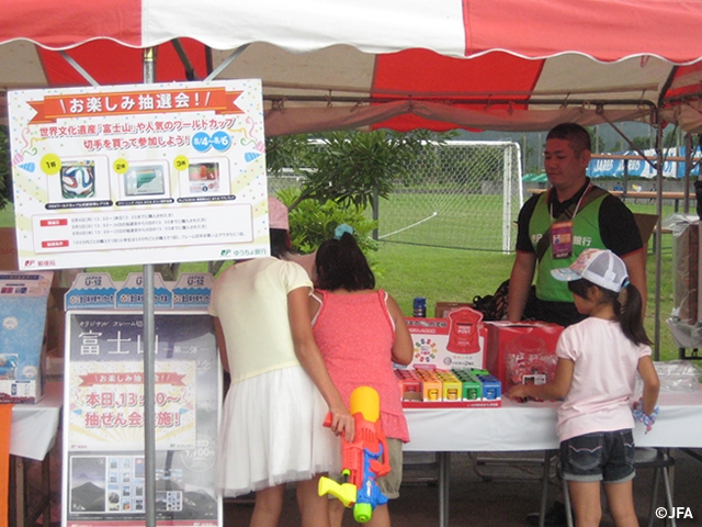 ゆうちょ銀行ブースでは、大会オリジナルポストカードの配布や富士山切手などを販売。購入者を対象とし、2014FIFAワールドカップ公式球レプリカが当たる抽選会も行いました。多くの子どもたちが参加し、笑顔と歓声で盛り上がりました。