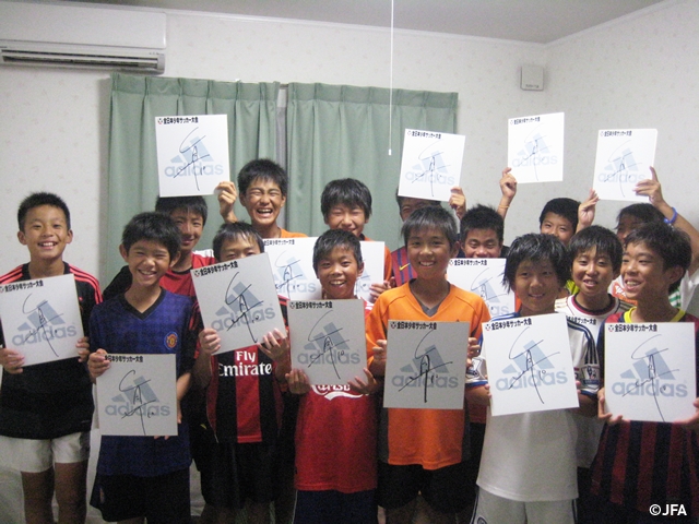 アディダスジャパンは、選手全員に大会オリジナルキャップ、シューズケースを、大会スタッフへもシャツ一式を提供しています。オリジナルキャップは大会期間中の選手の熱中症予防にも、大切な役割を果たしています。また、日本代表香川選手のサイン色紙が選手全員へ、さらにサインが描かれた大会公式ボールも抽選でプレゼントされ、選手は目を輝かせてアイテムを受け取っていました。受け取った選手からは「香川選手、これからも頑張ってください。僕も練習をたくさん頑張ります」と前向きなコメントが聞かれました。