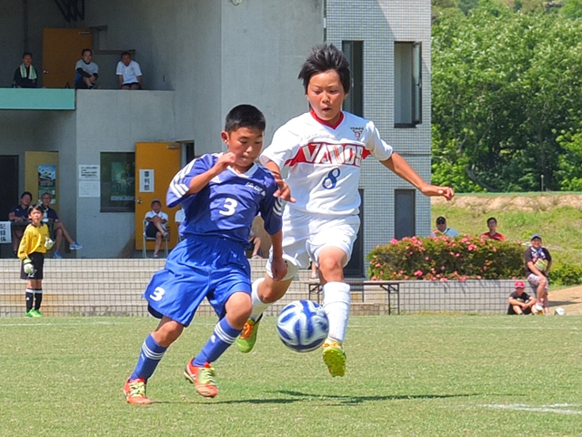 気温30度を超える中でのキックオフとなった決勝は、まずアンフィニが主導権を握り、小柄ながらテクニックに優れる森山悠真選手(背番号8)を起点に、佐藤優多選手(背番号17)や杉山悠人選手(背番号9)が次々とVAMOSゴールに迫ります。VAMOSもサイドの幸林聖悟選手(背番号8)や児山雄基選手(背番号10)へのロングボールから反撃を試みるも、アンフィニの堅い守りにことごとく阻まれ、前半はアンフィニ攻勢のまま終了しました。