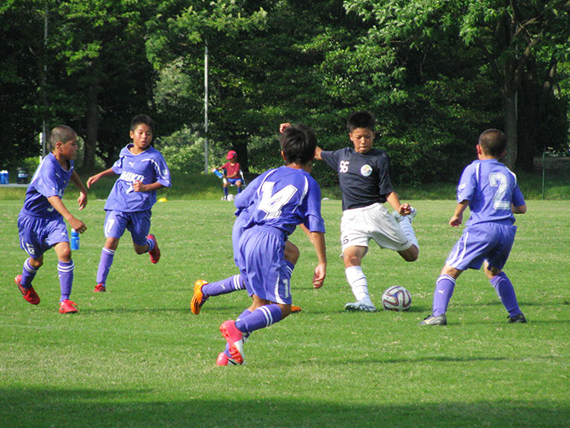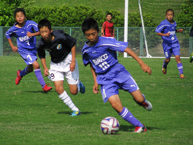 その決勝は、過去10回の全国大会出場を誇る京都紫光サッカークラブ(紫光)と、初優勝を狙う加茂フットボールクラブA(加茂A)の顔合わせ。準決勝で7-1と大勝した勢いそのままに、決勝でも紫光がキックオフから主導権を握ります。前半2分にペナルティエリア右外付近でFKを得ると、松原綾成選手が直接ゴール。その2分後には、三輪弘登選手のドリブル突破からつかんだ右CKを、松原選手が三輪選手の頭に合わせ、開始4分で2-0とします。しかし加茂Aも意地を見せてさらなる追加点は許さず、2-0の紫光リードで折り返しました。