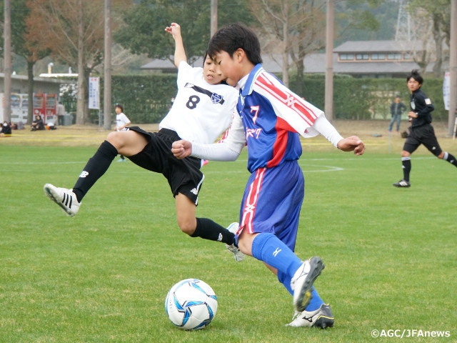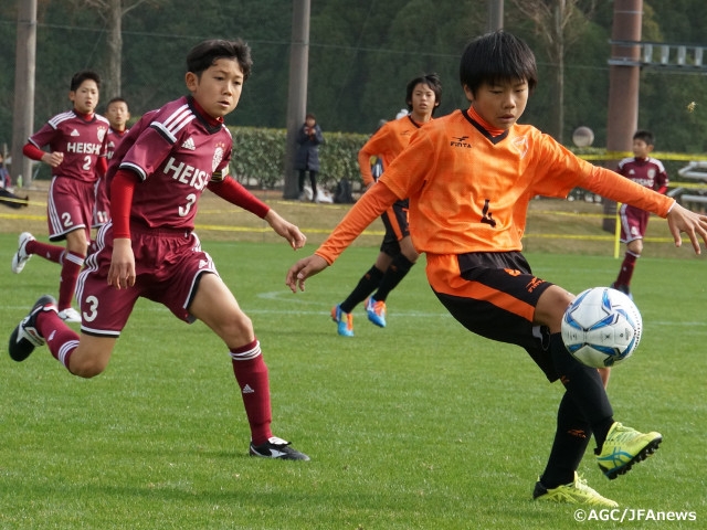 また、8組では野洲ジュニア・フットボール・クラブ(滋賀)と対戦した柏レイソルU-12(千葉)が序盤から攻勢に出ます。野洲も足元でボールをつないでゴールに迫りましたが、得点を返すことはできませんでした。同じく8組のJEF HACHINOHE FC(青森)とFC斐川(島根)の試合は白熱した展開に。1点を先制していたJEF HACHINOHEは16分、相手のクリアミスから小野柊大選手がゴール前に持ち込んで追加点。しかし斐川はその直後、セットプレーから渡部洸大選手が落ち着いて決めて詰め寄ると、持田優輝選手が3得点をマークする活躍もあって、2点のビハインドから逆転勝利を挙げました。