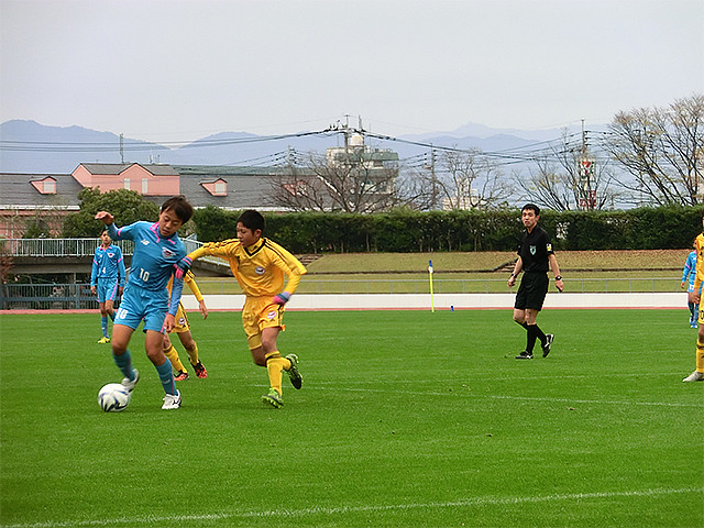 試合序盤は両チームとも積極的に縦への早い攻撃を仕掛けます。サガン鳥栖は前半7分、FW大渕選手がDFラインの背後へ飛び出しから冷静に決め、先制に成功。その後も両サイドを起点に攻撃を続け、13分にMF福地選手、18分にFW大渕選手が追加点を奪います。肥前FCジュニアは細かいパスワークから中央突破を試みますが、サガン鳥栖の堅い守備陣を前に決定機が作れず、前半を0-3で終了しました。