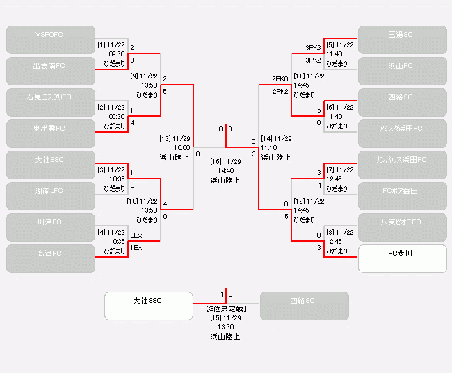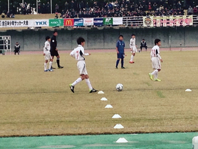 後半、攻撃を立て直した東出雲FCが徐々にペースを掴みシュートを放つ場面が多くなってきましたが、予選から無失点のFC斐川の堅い守備を崩すことが出来ない展開が続きます。残り3分ほどになったところでGKからのロングフィードを持田選手が相手DFとの競り合いから抜け出し、決定的なゴールとなる3点目を決め、3-0で試合が終了しました。