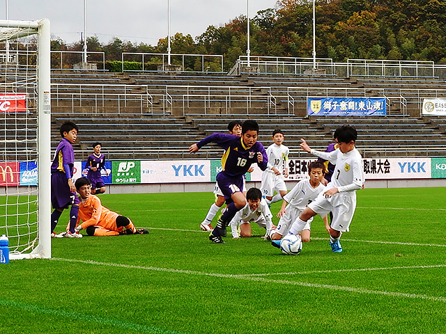 気温が低く小雨が降りしきる肌寒い中で行われた、第39回全日本少年サッカー大会鳥取県大会決勝は、2年連続14回目の優勝を目指すFCアミーゴと初優勝を狙う東山ジュニアFCの対戦となりました。試合は、前半からお互いアグレッシブにゴールを目指しボールを奪い合う展開となりました。FCアミーゴは背後のスペースを積極的に狙う攻撃で、対する東山ジュニアFCはサイドを使った攻撃を仕掛け合いますが、ペナルティーエリアの中での体を張った守備により前半を無得点で終了します。