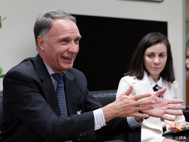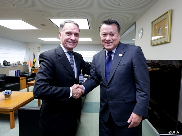 アルゼンチン共和国からJFA全日本U-12サッカー選手権大会に賞杯が寄贈されることが決まり、駐日アルゼンチン共和国のアラン・ベロー大使が11月13日(火)、JFAハウス(東京都文京区)を訪れ、田嶋幸三JFA会長にアルゼンチン共和国杯を手渡しました。