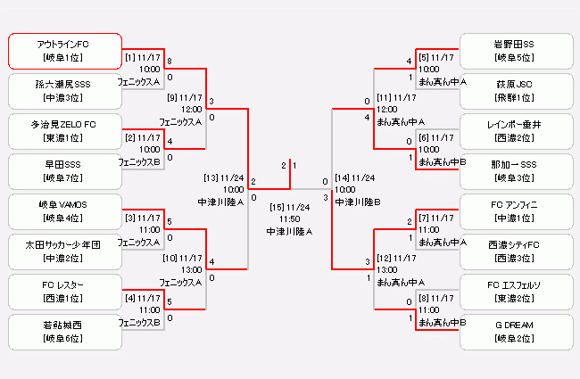 対戦カードは岐阜地区予選、中濃地区予選をそれぞれ1位で勝ち抜いたアウトラインFC U-12とF.C.ENFINIです。アウトラインは県大会を孫六瀬尻8-0、多治見ZELO3-0、準決勝VAMOS2-0で破って、対するENFINIは西濃シティー2-1、G DREAM3-1、準決勝那加一SSS3-0で破って決勝戦進出です。