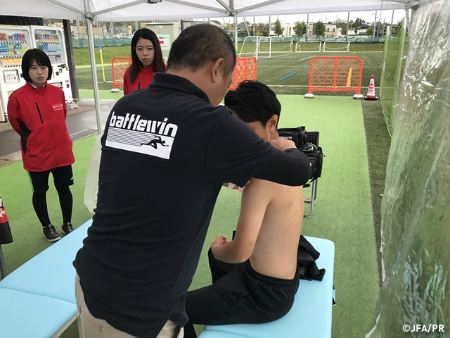 昨日朝一番でブースに来て肩を巻いてもらいました。普段は自分では肩は巻けないのでやっていませんが、昨日巻いてもらって1試合戦ってみたら全然違いました。ボールを蹴るときの腕振りで無理がかかったときにどうしても痛みが出てしまうのですが、サポートをしていただいた結果それが軽減されたので今日も受けにきました。