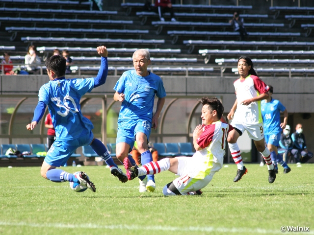グループCでも、最終戦まで接戦が続きました。第2戦では、初戦で惜敗していた徳島SFC(四国/徳島)が勝利を挙げ、もう1試合では前回王者のFC船橋(関東3/千葉)が首位のいわきシニアFC(東北1/福島)と引き分けて混戦状態に。最終戦で逆転突破を狙った徳島と船橋が引き分けると、いわきが勝ち点3を上乗せしてグループ突破。船橋の連覇はなりませんでした。