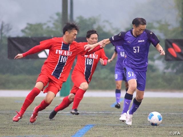 グループDでは、FC.西武台(関東2/埼玉)が前後半の開始早々に1点ずつ奪ってGALAXY(中国2/山口)2-0で勝利。富一ふじの会(北信越/富山)といわきシニアFC(東北/福島)が引き分けたことで、FC.西武台が首位に立っています。