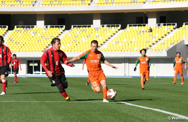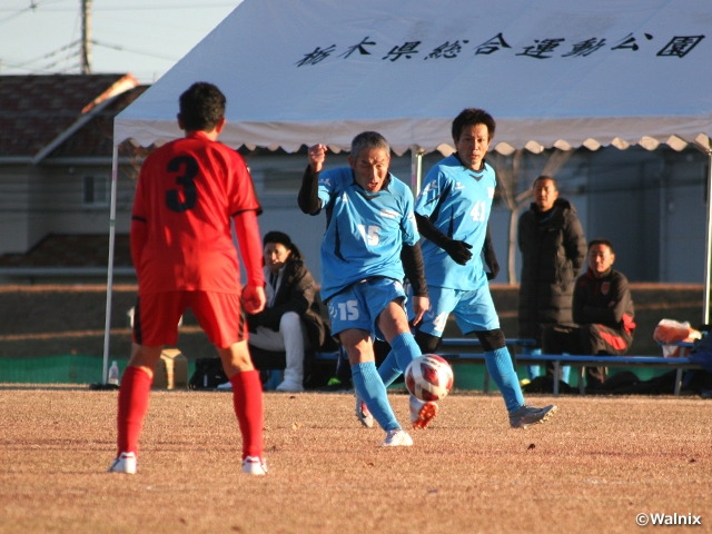 グループAでは、地元の栃木教員マスターズ(開催地/栃木)が白星発進しました。ニコルスFCシニア(関西1/大阪)にリードを許して前半を終えますが、後半早々にキャプテンの福田成一選手のゴールで追いつくと、2点を追加して逆転。1点を返されたものの、うれしい勝利を手にしました。同グループの徳島SFC(四国/徳島)と富一ふじの会(北信越2/富山)が引き分けたため、首位に立っています。