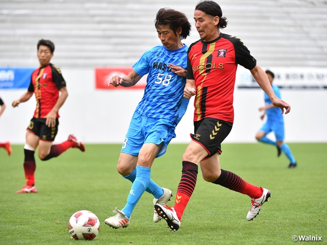 準決勝は、2試合とも接戦となりました。ニコルスFCシニア(関西/大阪)は、前半に自陣からの素早い攻撃で先制。羅針盤倶楽部NAGOYA(東海/愛知)の攻撃をしのぎ切り、1-0で勝利しました。前回4強同士のFC船橋(関東4/千葉)と山梨マスターズの対戦は、0-0のまま試合が進み、PK戦へと突入。GK丸山孝選手のセーブもあり、山梨マスターズが決勝進出を勝ち取りました。