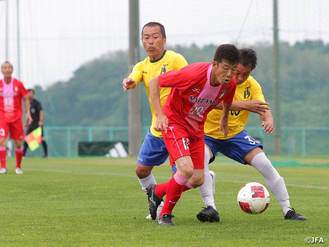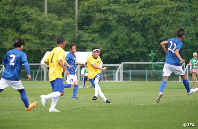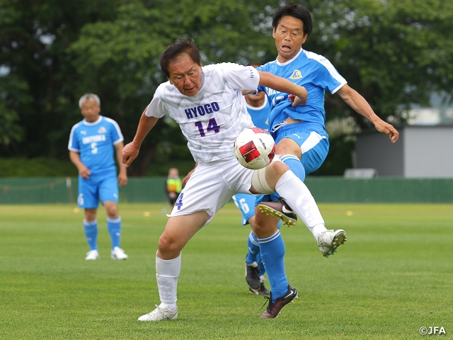 一方、静岡県選抜O-60(東海2/静岡)と兵庫県シニア60選抜(関西1/兵庫)の試合は、序盤から静岡が何度もチャンスをつくりましたが、11分に兵庫が先制点を奪います。ビハインドに立った静岡は諦めることなく攻撃を続けると、後半アディショナルタイム、CKからのこぼれ球を押し込んで同点に追いつきます。迎えたPK戦では両チームとも4人目までが成功しましたが、静岡の5人目が外し、兵庫の勝ち上がりが決まりました。