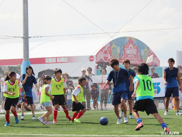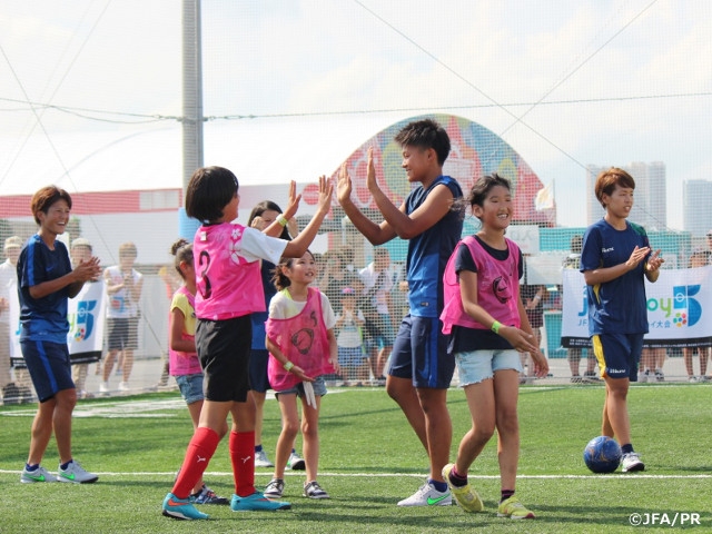 日本サッカー協会は8月16日(日)、「2015/16 JFAエンジョイ5」のプロモーションイベントをお台場夢大陸 オマツリランド内 【すぽると!ドリームフィールド】で開催しました。ゲストに日テレ・ベレーザの岩清水梓選手、有吉佐織選手、山下杏也加選手、浦和レッズレディースの柴田華絵選手を迎え、女子小学生とのミニフットサルゲーム「エンジョイ5プレマッチ」やトークショーを行いました。