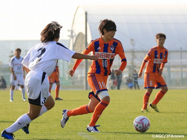 NGU名古屋FCレディースユースとASエルフェン埼玉マリの一戦で、ファーストシュートを放ったのは名古屋FCでしたが、これをGKのセーブでしのいだ埼玉マリは4分、佐藤萌選手のCKをキャプテンの須田胡桃選手が頭で合わせて先制します。さらにその3分後、前回大会の初戦でもゴールを決めた永島自然選手が裏に抜け出してシュートを決め、リードを2点に広げます。一方の名古屋FCも時間の経過とともにペースを握って反撃を試みましたが、決定打を放つことはできず、0-2のまま前半を折り返しました。