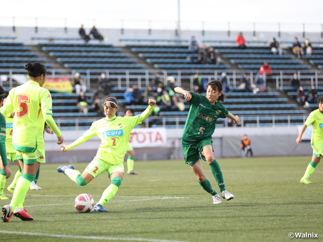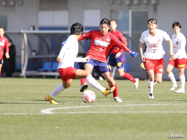 「ボールを大事にすること」をテーマとする浦和が、序盤からボールを支配します。強風の影響を受けながらも、細かくパスをつなぎ、FW島田芽依選手のポストプレーや左サイドの丹野凜々香選手のドリブル突破から再三ゴールを脅かしますが、ノジマのGK本多陽菜選手の好セーブに阻まれ、得点には至りません。