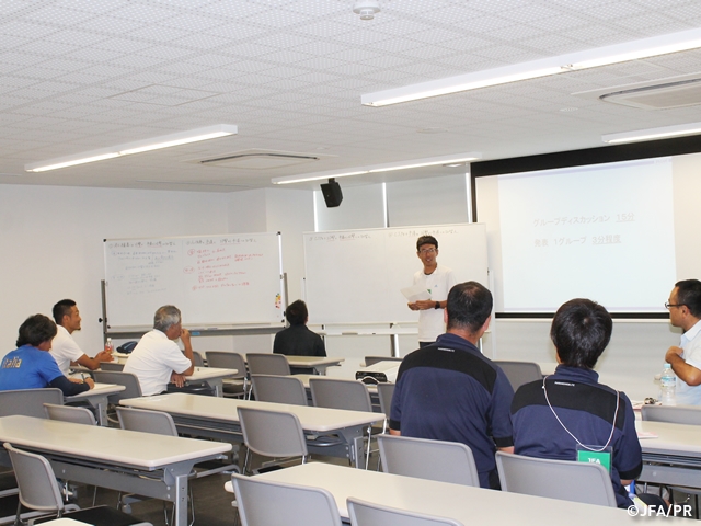7月31日(金)はメインピッチにてJFAアカデミー福島(東海1/静岡)とセレッソ大阪堺ガールズ(関西2/大阪)の決勝を観戦し、その後各グループごとにディスカッションを実施。また6月、7月に行われたFIFA女子ワールドカップや昨年行われたFIFAU-17女子ワールドカップ、U-20女子ワールドカップの分析から、世界のトレンドと日本の課題についての報告がありました。