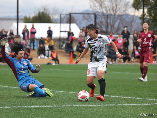 「相手は片方のサイドに片寄るのは分かっていたので、自信のあるドリブルで縦を狙っていた」そう話す野村七虹選手が切れ味鋭い突破で左サイドを何度も突破すると、18分には左CKの流れからPKを獲得。このチャンスを平七海選手が冷静に決めて均衡を崩しました。先制点で勢いに乗ったI神戸は29分に野村七虹選手のパスから黒崎琉衣選手がゴール。40+1分にも相手の守備の乱れを突いて、3点リードで前半を終えました。
