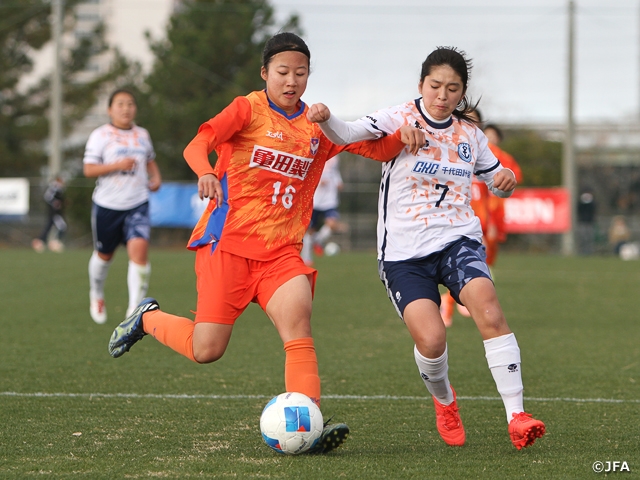 試合は、立ち上がりからジェフユナイテッド市原・千葉レディースU-18(関東3/千葉)が主導権を握る展開となります。11分、永田真帆選手のクロスからチャンスをつくり、最後は小久保まい選手が押し込んで先制します。18分にも永田選手のパスから小久保選手が決め、千葉Lがリードを広げます。