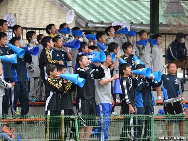 麗らかな春の日差しの下、2チームが熱戦を繰り広げました。清水エスパルスユース(静岡)は序盤、JFAアカデミー福島(福島)の厳しいプレッシャーに遭い、なかなかボールを前に運べません。「立ち上がりは自分たちのサッカーが何一つできなかった」と森主麗司選手が振り返る通り、低い位置で奪われピンチを招くと、34分にはアカデミー福島の加賀山泰毅選手に頭で決められ、リードを許します。しかし、「疲れが見え始めた」(清水・大榎克己監督)相手に対し、清水は反撃を開始。36分に福井悠陽選手の左足のシュートで追いつくと、40分には宮本航汰選手が逆転、さらに45分には望月大選手の得点で突き放しました。