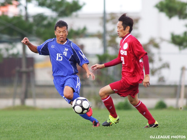 もう一方の準決勝は、三重マスターズ(東海2/三重)と沖縄シニアセンバツ(九州/沖縄)が対戦。前半7分、三重は山中俊樹選手が放ったループ気味のシュートがクロスバーをかすめ、惜しい場面をつくります。後半に入ると、沖縄が反撃に出ます。21分に大城晋選手のシュートがゴールわずか右に外れると、その1分後には高良清和選手がDF2人を振り切りシュート。これが見事にネットを揺らし、沖縄がそのまま1-0で勝利をつかみました。