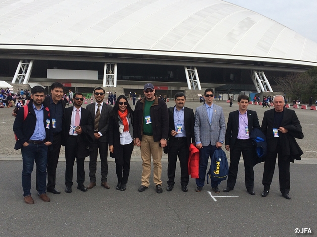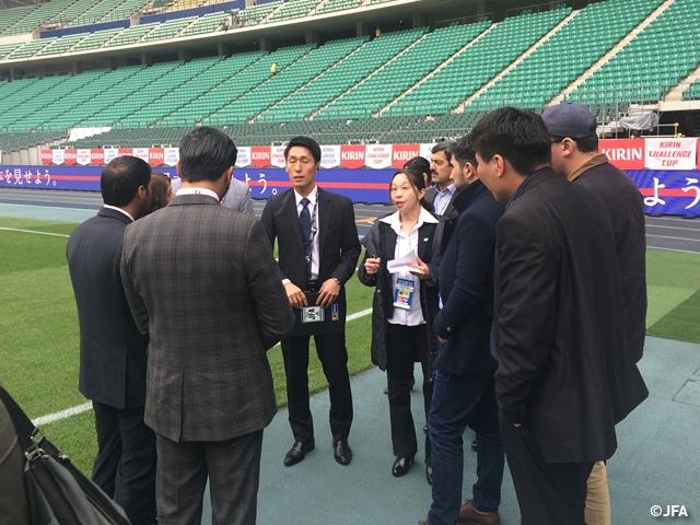 本プログラムには各国から競技運営担当、マーケティング担当が1名づつチームに帯同しています。期間中のプログラムを通して競技運営力とマーケティング力の向上を目的とし、各国担当者を3月27日(金)大分スポーツ公園総合競技場にて行われたキリンチャレンジカップ2015 SAMURAI BLUE(日本代表) 対 チュニジア代表戦に招き、研修を行いました。当日は試合開始前のスタジアム見学を中心とし、日本サッカー協会のマーケティング担当者より約2時間の説明を実施。実際の会場を見学するとさまざまな質問が挙がり、充実した時間を過ごしました。