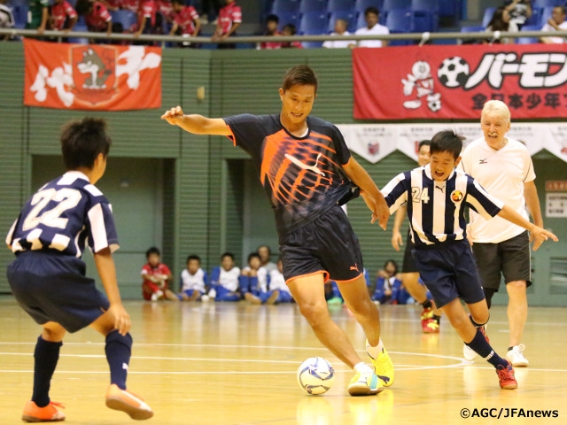 開会式後にはゲストのサッカー解説者のマリーニョ氏、元サッカー日本代表の福西崇史氏、三浦淳宏氏、中田浩二氏、現役Fリーガーの小宮山友祐選手(バルドラール浦安)、木村尚樹選手(バルドラール浦安)、西谷良介選手(フウガドールすみだ)、金山友紀選手(ペスカドーラ町田)、皆本晃選手(府中アスレティックFC)、小野大輔選手(湘南ベルマーレ)の10名が2チームにわかれて参加チームと対戦するエキシビションマッチを開催。選手たちは、トッププレーヤーのスピード、技術の高さを体感すると同時に、日本一を決める駒沢のコートの感触を確かめていました。