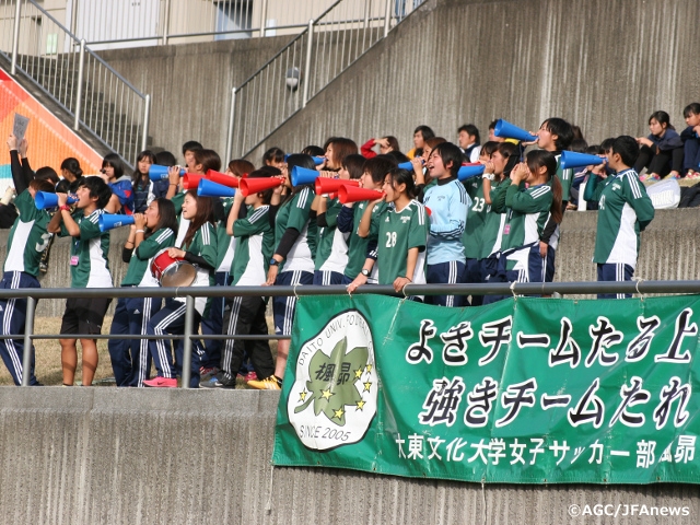 3回戦に残った大学勢の一つである大東文化大学(関東3/埼玉)は、強敵に挑戦しました。今季、なでしこリーグ1部で2位となったベガルタ仙台レディース(なでしこ1部/宮城)との対戦です。試合は、カテゴリーの差そのままに、ベガルタが先制します。7分、CKの流れから有町紗央理選手が決めました。ベガルタはボールを素早く動かし続け、大東文化大を揺さぶり続けます。すると前半終了間際にはペナルティーエリア内で有町選手が折り返したクロスを井上綾香選手が決めて、ベガルタが2-0とリードを広げます。