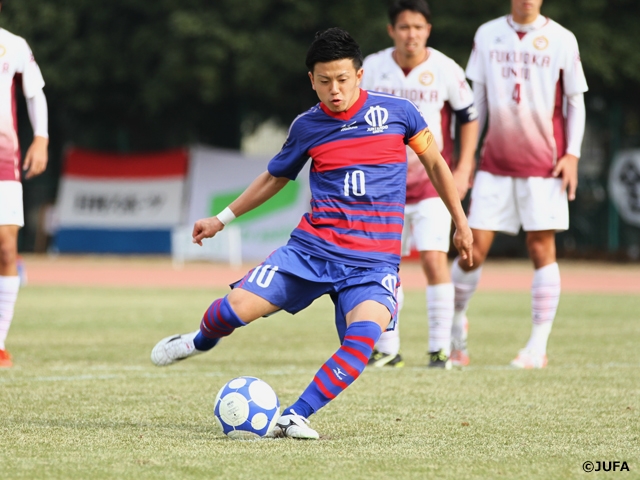 互いに丁寧にボールを動かす慎重な立ち上がりとなった試合は、思わぬ形で順天堂大が先制点のチャンスを得ました。23分、ゴール前に抜け出した佐野翼選手に、福岡大GK・永石拓海選手の手がかかり、順天堂大がPKを獲得。これをキャプテンの長谷川竜也選手が落ち着いて決め、順天堂大学が1-0とリードします。