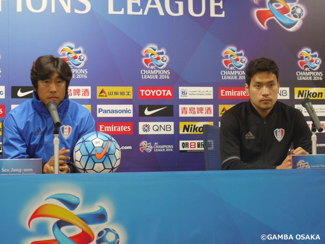 AFCチャンピオンズリーグ2016 グループGのガンバ大阪は19日(火)、ノックアウトステージ進出に一縷の望みをかけて韓国の水原三星ブルーウィングスと対戦します。試合前日にはスタジアムで公式記者会見が行われ、両チームの監督と選手が翌日の決戦に向けてそれぞれ抱負を述べました。