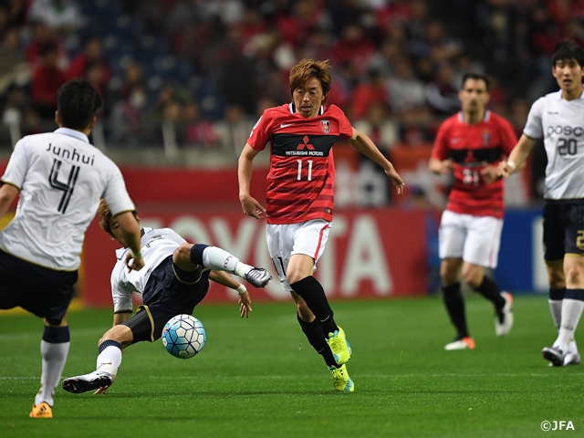 浦項戦に勝って、グループ首位のシドニーFCが前回大会覇者の広州恒大(中国)に敗れれば1位突破が決まる浦和は、4日前に快勝したJ1リーグの名古屋戦からGK西川周作選手、MF柏木陽介選手、MF梅﨑司選手以外の先発を入れ替える布陣で臨みましたが、強風の影響や慣れない組み合わせでのプレーにミスが多く、テンポよくパスをつなぐことができません。