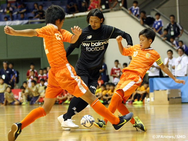 その後、駒沢体育館のピッチでは、元フットサル日本代表監督のアデマール・ペレイラ・マリーニョ氏、元サッカー日本代表の鈴木隆行氏、鈴木啓太氏、元フットサル日本代表の北原亘氏、鳩野大介氏、お笑いタレントの加藤ディエゴマラドーナ氏、フットボールのパフォーマンス集団・球舞の4名の計10名がゲストに登場し、2チームに分かれて参加チームと対戦するエキシビションマッチを開催しました。鈴木隆行氏は「今日はお父さんお母さんに代わって、人生の厳しさを教えようと思います」とコメントし、選手たちを鼓舞するかのように、何本もの強烈なシュートを決めていました。