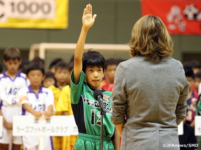 「宣誓、僕たちは、それぞれの都道府県予選を戦い、今こうしてバーモントカップ第26回全日本少年フットサル大会決勝大会に出場しています。これは決して、自分たちだけの力ではありません。これまで共に練習してきたチームの仲間、熱いご指導をいただいた監督、コーチ、そして応援をしていただいた保護者の皆さま、全ての方々のおかげだと感謝しています。われわれ選手一同は、この大会に参加した全ての選手の思いを背負い、感謝の気持ちを胸に、最後まであきらめず、全力で戦うことを誓います」