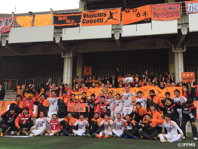 自分たちの試合の後の第2試合の結果で2位以内が確定し「ほっとした」という気持ちでした。昨日(2日目:vs ヴィアティン三重戦)は、選手に「サッカーが大好きだという気持ちを思い出してやってほしい」と伝え、勝てたことは良かったです。JFL昇格の条件である成績を取れた最大の要因は、クラブ全体の力であると思っています。フロント・選手・サポーターすべての力が集結した結果で、誰かが一人頑張ったから、というものではないと思います。今年のシーズンがスタートした時から、(来年今治に出来る)5000人のスタジアムを満員にするような、サポーターの皆様に来てもらえるような、魅力あるゲームをすることをテーマとしてきました。 また来年からの新しいステージに向けて、さらにやっていきたいと思います。本当に心から喜べる瞬間は少ないと思っていますので、今日は、選手たちに思う存分喜びに浸ってもらいたいと思います。