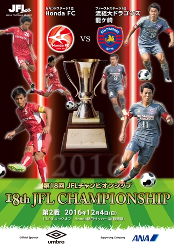 今季のJFL優勝チームを決するJFLチャンピオンシップ第2戦、Honda FC 対 流経大ドラゴンズ龍ケ崎が12月4日(日)、Honda都田サッカー場で開催されます。