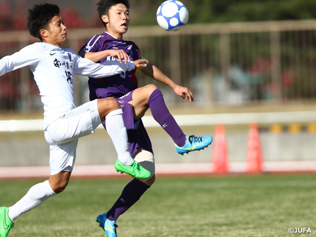 昨年度優勝校で関西第2代表の関西学院大学は専修大学と対戦しました。関西学院大学は18分のゴールを皮切りに、昨年度大会MVPの出岡大輝選手が前半だけでハットトリックを達成します。さらに後半に入り62分に、ルーキーの山本悠樹選手がこぼれ球に詰めて追加点を挙げると、試合終盤の82分にも出岡選手が自身4点目となるゴールを決めます。結果、5-0という大差で専修大学を下した関西学院大学が、連覇に向けて一歩を進めました。