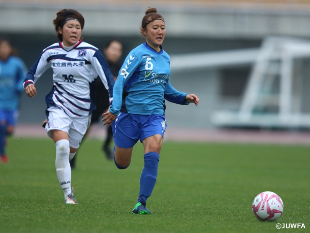 関東第6代表の東京国際大学と東海第1代表の静岡産業大学との対戦。試合開始序盤から一進一退の攻防が続きます。静岡産業大学は堀江美月選手を起点に攻撃を展開。16分に堀江選手が味方からのヘディングでボールを受けるとうまく体を入れてターン、迷わず右足を振ると40m程のロングシュートが相手GKの頭上を越えネットを揺らします。続く30分には、城下千夏選手のクロスを相手DFがクリアミス。そこを田中綾香選手が逃さず決めます。しかし、すぐに東京国際大学が反撃。サイドを起点とした攻撃から相手ゴールに迫ります。31分に庄優奈選手と大久保萌選手のワンツーで相手を崩し、最後は庄選手がゴール左隅に落ち着いて決め、2-1で前半を折り返します。